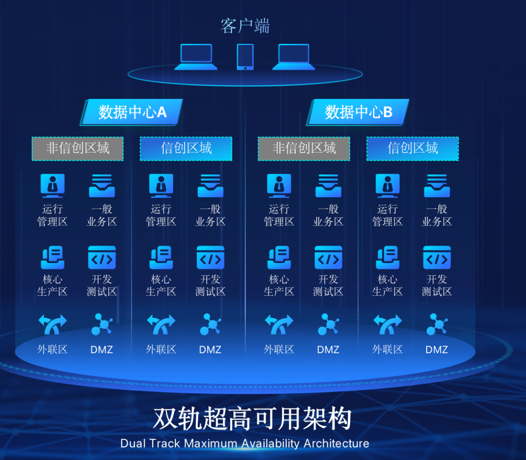 PA视讯国际 PA国际在企业面临自主创新IT基础重构过程中,推出的全新架构双轨超高可用架构(简称DTMAA),在双活数据中心的分区调度基础上,添加每个数据中心内信创域和非信创域的分域调度,来实现分区分域协同的多活双轨超高可用。
